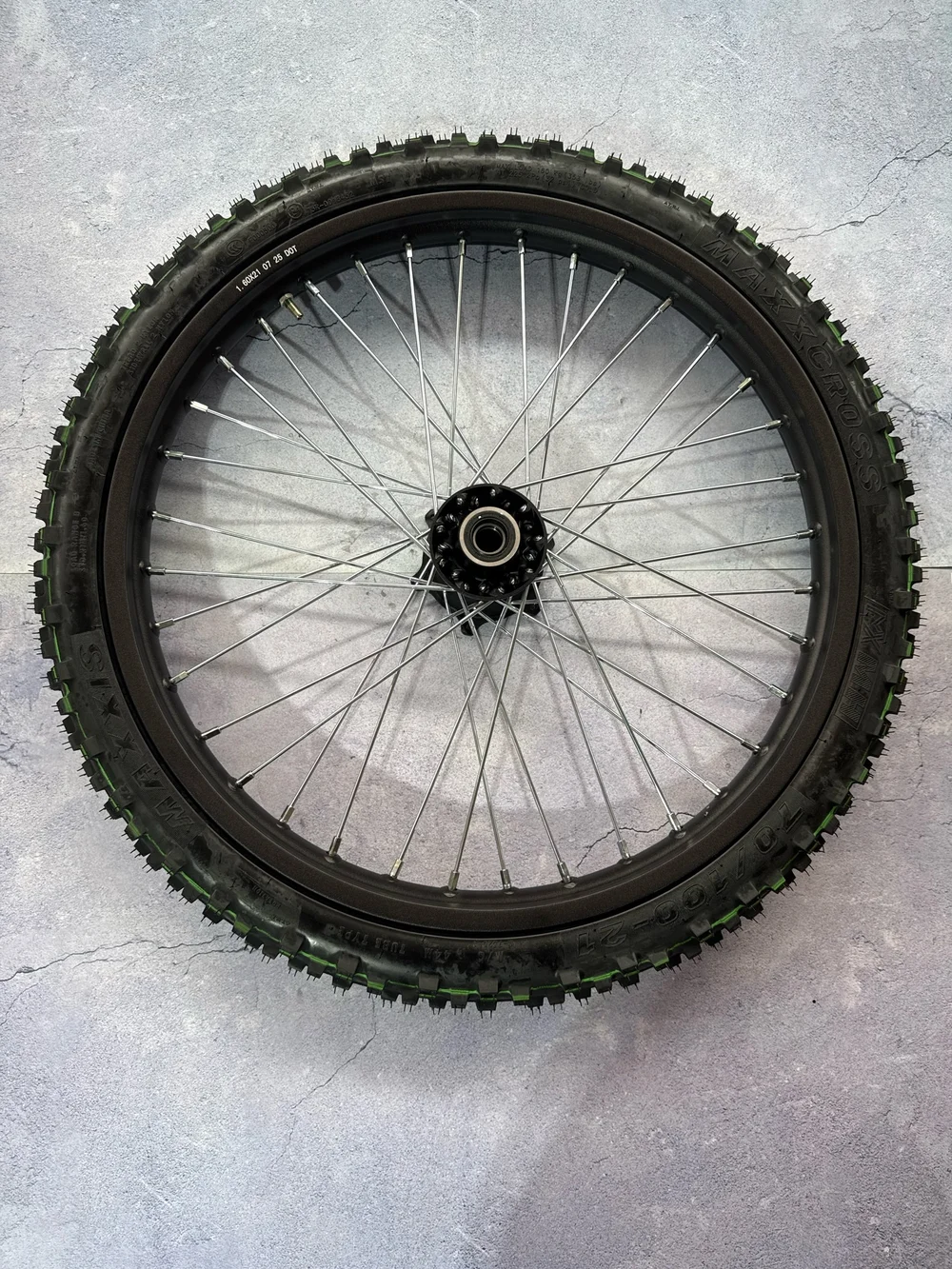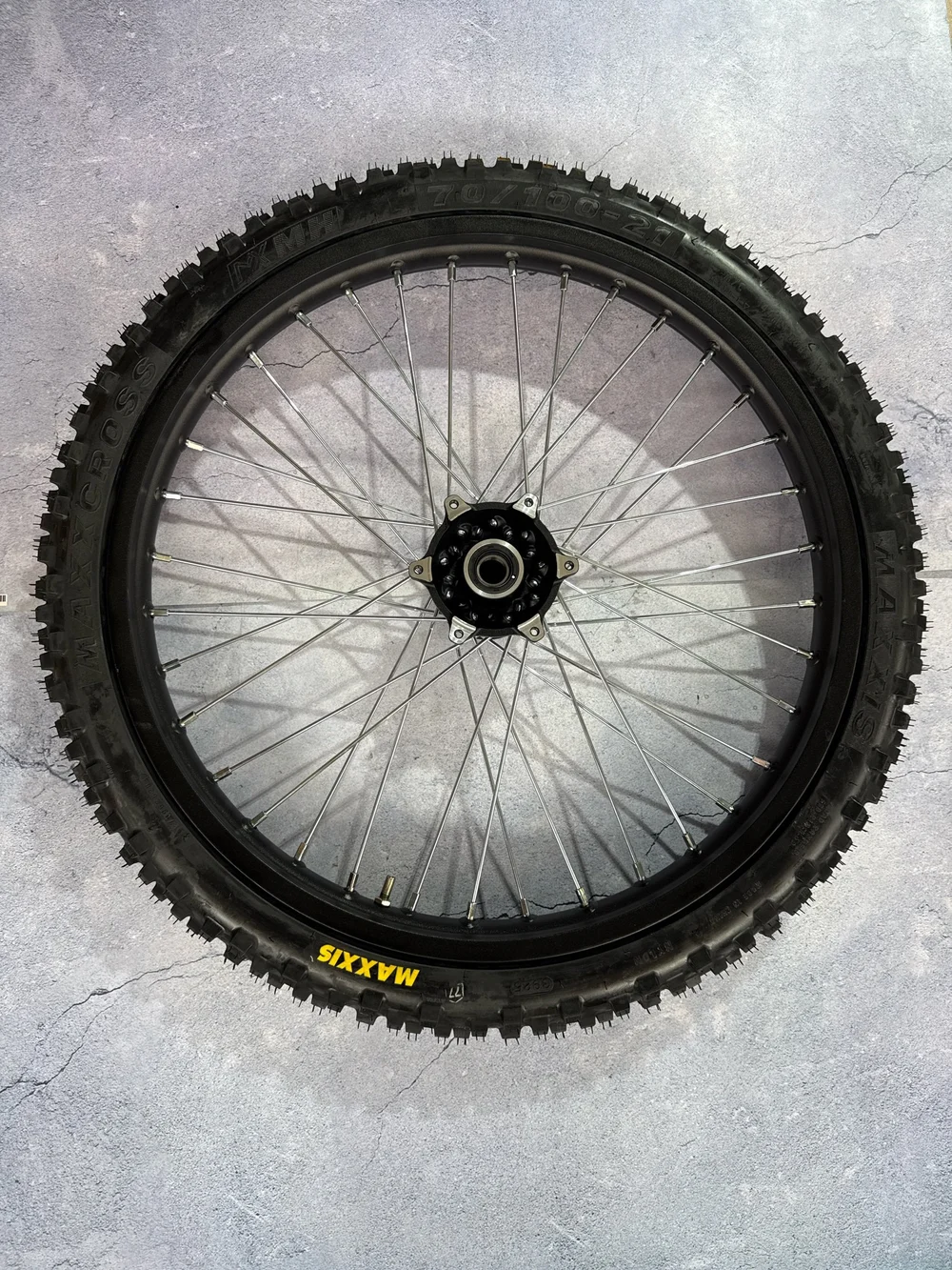 This assembly features a robust 21 x 1.6-inch aluminum rim, compatible with high-grip tires like Maxxis 80/100-21 or CST 70/100-21, optimizing traction on rocks, roots, and loose terrain. Paired with the bike’s dual-chamber fork (850mm length, 43mm tubes, 250mm travel), it raises the front end for better ground clearance—around 315mm total—reducing frame scrapes during aggressive riding.